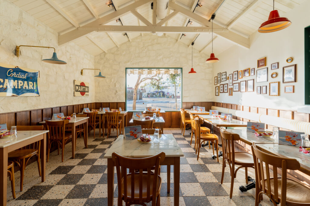 The architecture of the room transports you straight to the cobblestone streets of Rome. Magnificent high ceilings create an airy, communal atmosphere, while the walls are adorned with cherished family pictures, offering an intimate window into Nonna Elvira’s legacy. Guests are invited to settle into comfortable, banquette seating at classic marble-top tables, the quintessential setting for a long, lingering Roman lunch or a festive evening celebration.